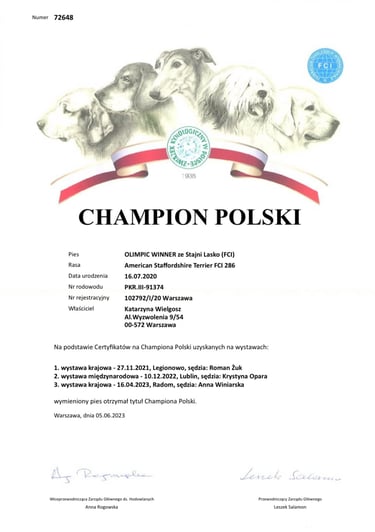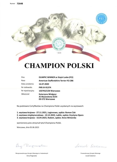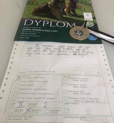 Aby być dziś w tym miejscu, w którym jesteśmy - ostro trenowałam, ukończyłam wiele kursów i szkoleń. Między innymi kurs Asystenta Kynologicznego. Udzielam się w Związku Kynologicznym w Polsce - jestem zastępcą Kierownika Sekcji Grupy III, w Oddziale Legionowo. Pokazujemy się na wystawach - z sukcesami. Można nas zobaczyć również jako obsługa na ringach. Nabywamy wiedzy, doświadczenia i praktyki. Każdą cenną dla nas wiedzę, wskazówkę przyjmujemy z otwartą głową i pokorą.